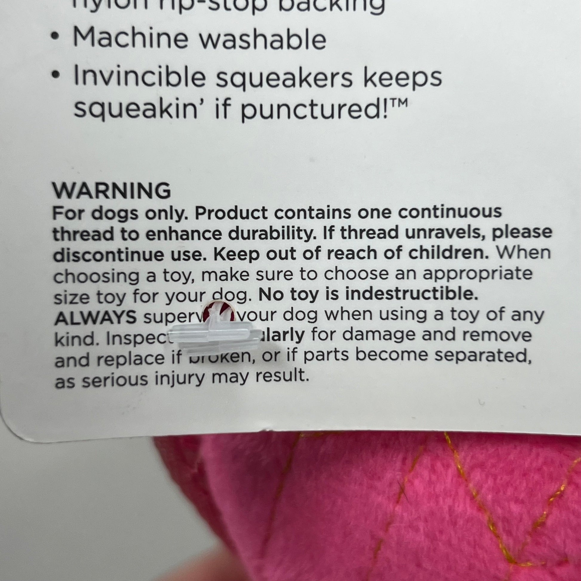 Describe: Triple Stitched Binding Covering the Seams With Tight Quilting and Fused Nylon Rip Stop Backing on the Body Dense Interior Stuffing. Features a Speaker That Keeps Squeaking Even When Punctured Made With Heavy Duty Materials